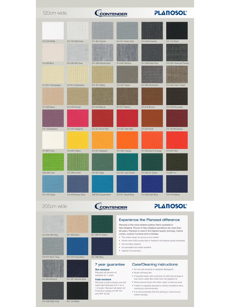 Planosol® is a solution-dyed acrylic fabric engineered to maintain its colour and flexibility in New Zealand’s intense UV environment. It offers a classic woven look while providing robust protection against sun, wind, and rain.